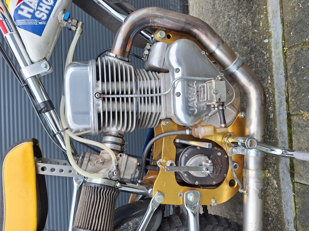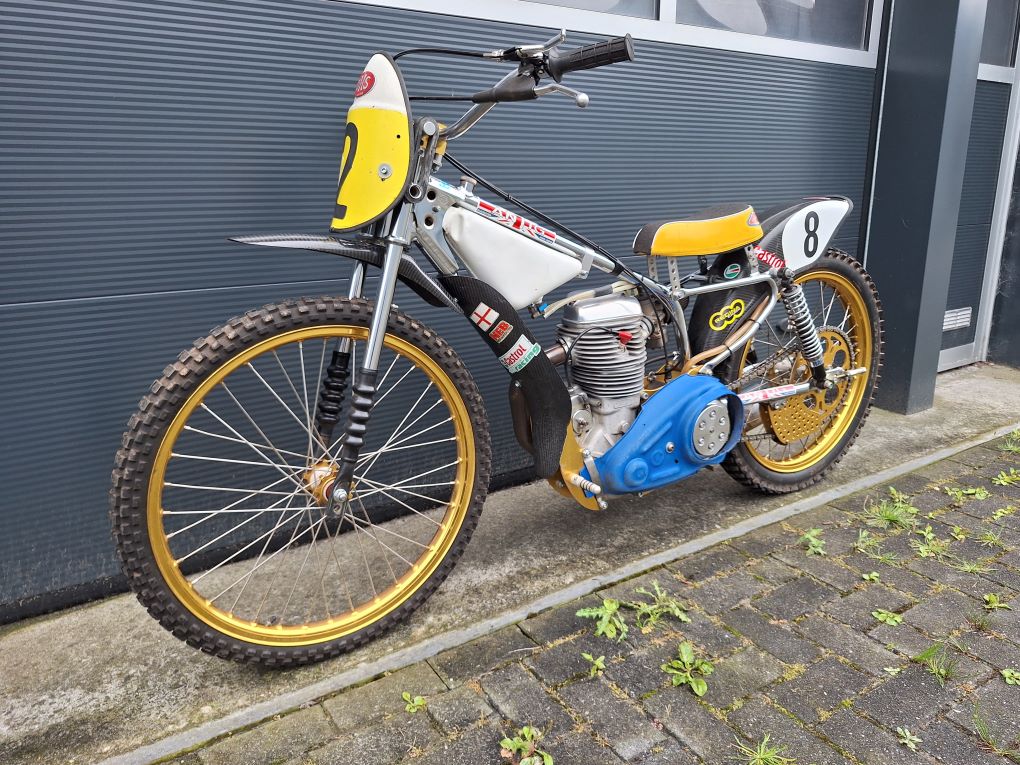 JAWA Eso DT500 EVLS Grasbaanmotor, geheel nieuw opgebouwd uit hoofdzakelijk nieuwe replica onderdelen van topkwaliteit. Nieuw Antig frame, schetsplaten, voorvork, stuurklemmen, spanners enz. Nieuwe Godden 2-versnellings "automaat" bak, nieuwe NEB koppeling, King demper, nieuwe Hagon schokbrekers, nieuw gereviseerde en verbeterde PAL magneet, nieuwe Talon wielen enz.